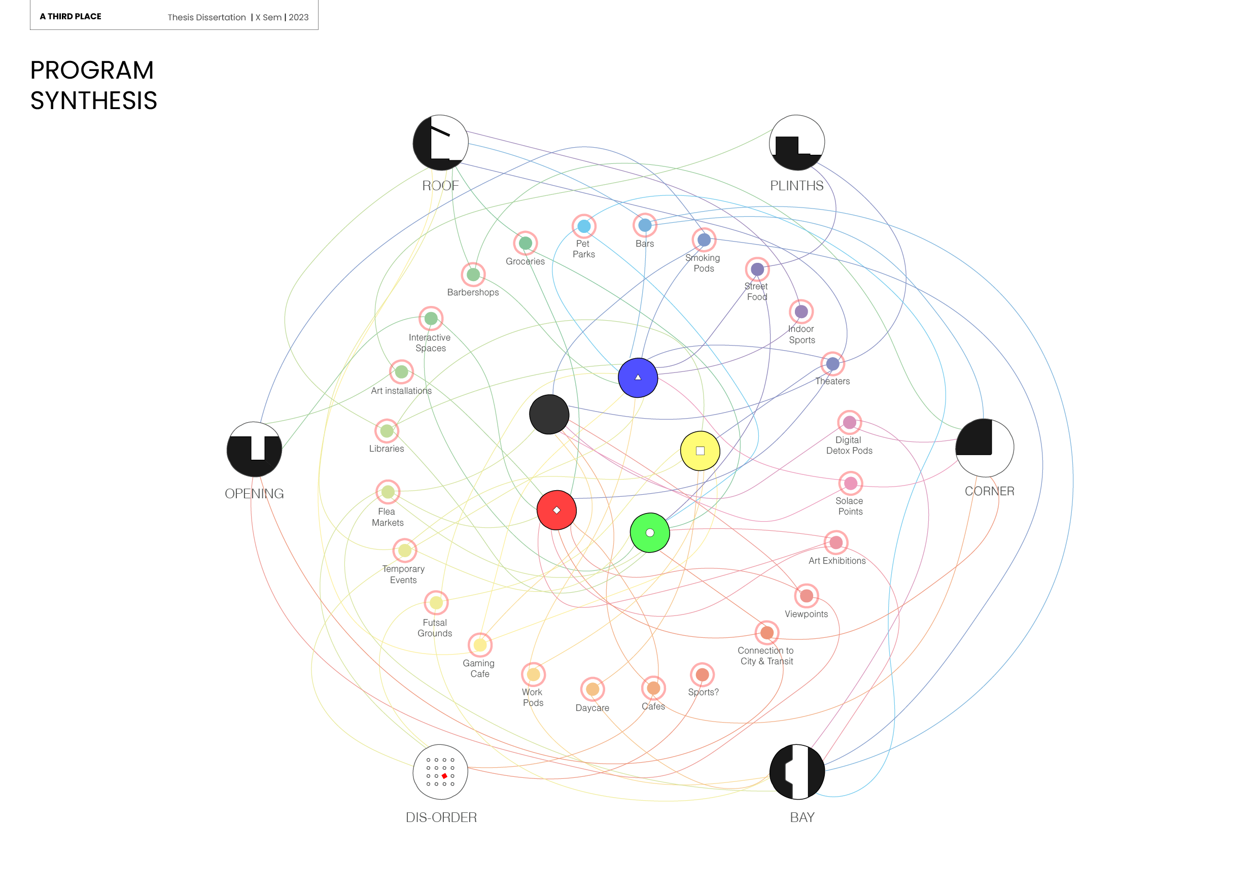 Synthesized case study analysis and user research into a framework showing which programs connect with which spatial configurations. The outer ring shows spatial attributes from the precedent studies (roof, opening, corner, bay, dis-order, plinths). Inner nodes show programs responding to user survey priorities (cafes, libraries, sports, theaters, groceries, etc.).