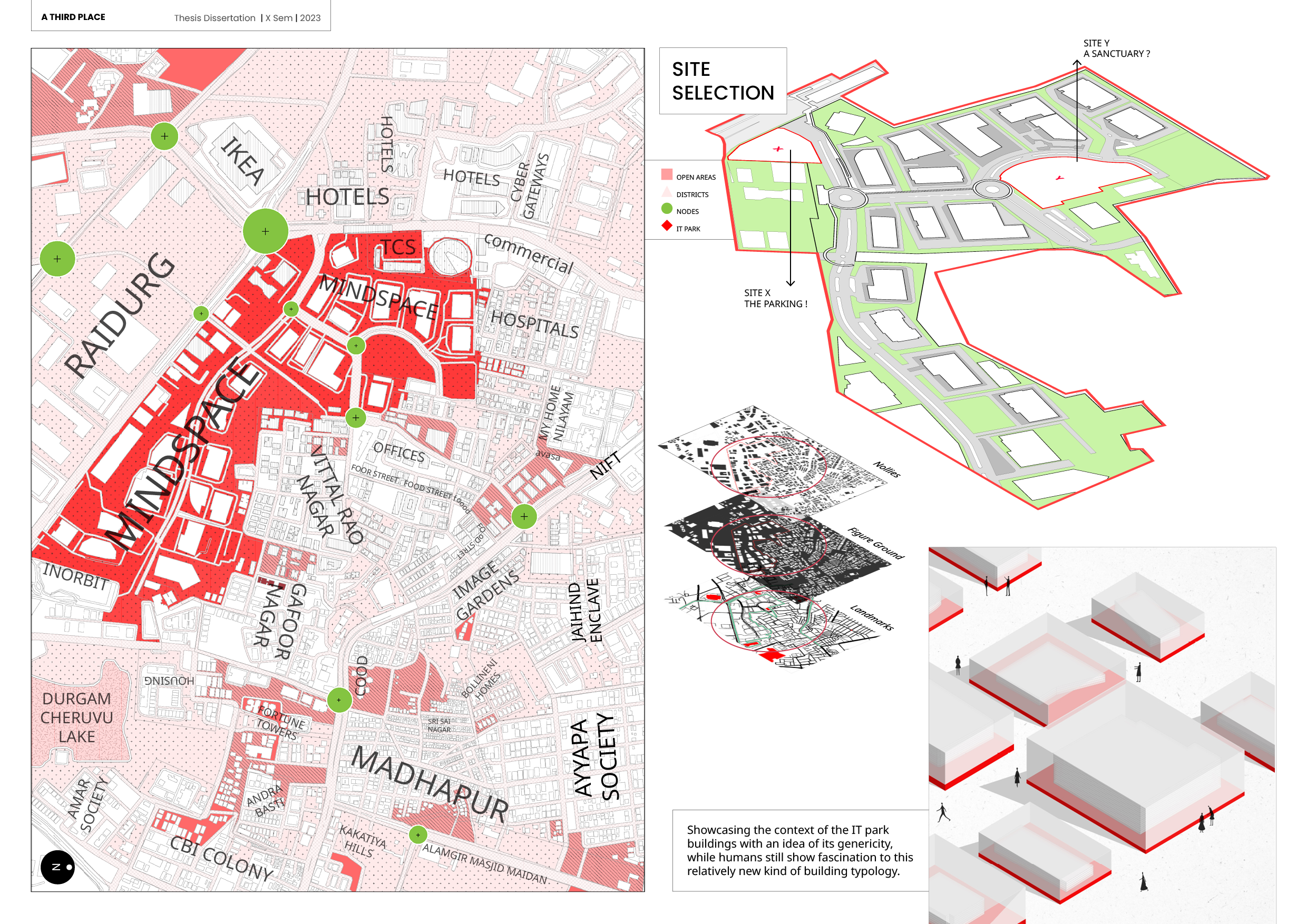 Selected an underutilized site adjacent to Madhapur’s IT corridor, targeting workers aged 18-30. The location sits between major tech campuses (Mindspace, Image Towers) and existing transit nodes, making it accessible within a short walk from multiple office buildings.