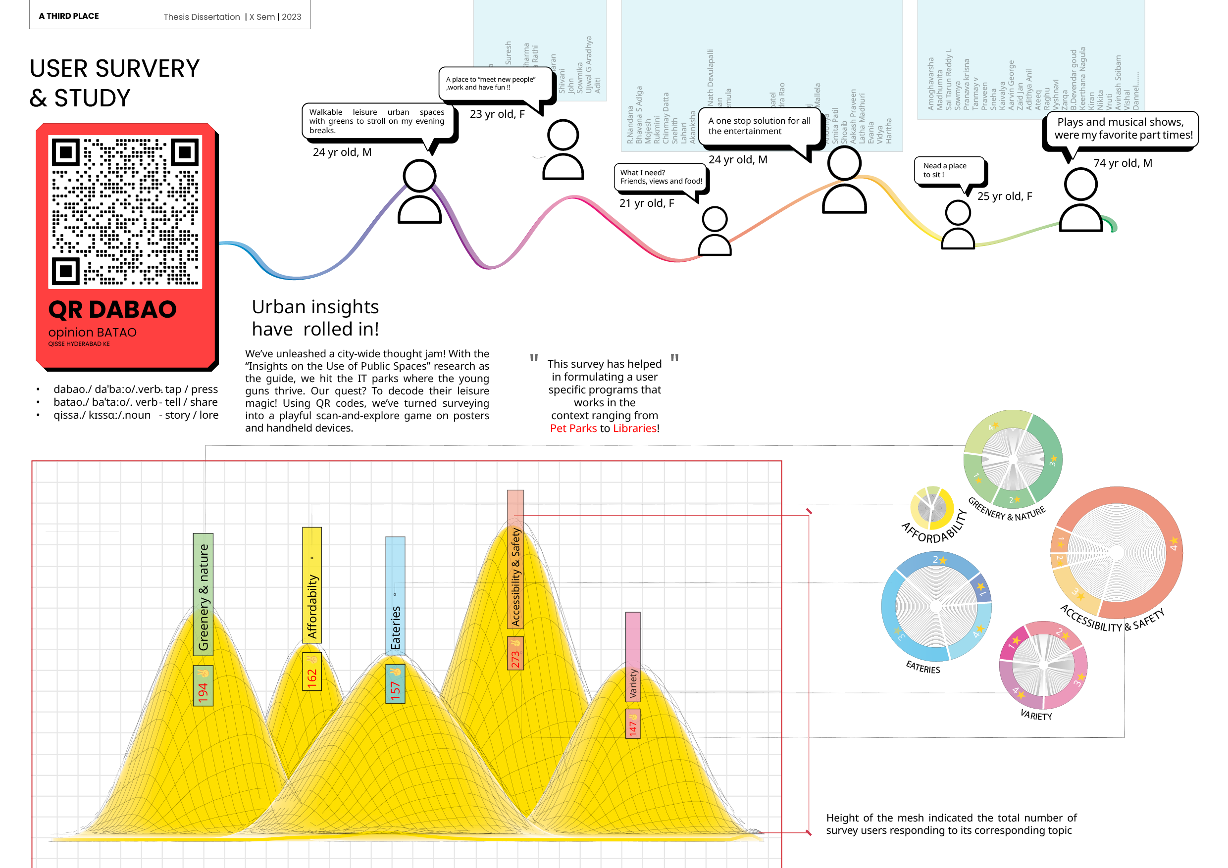 Distributed QR-coded posters across IT park corridors, collecting responses from 200+ workers about their leisure needs. The data revealed a proximity problem: workers value cafes and parks, but won’t travel for them after long commutes.